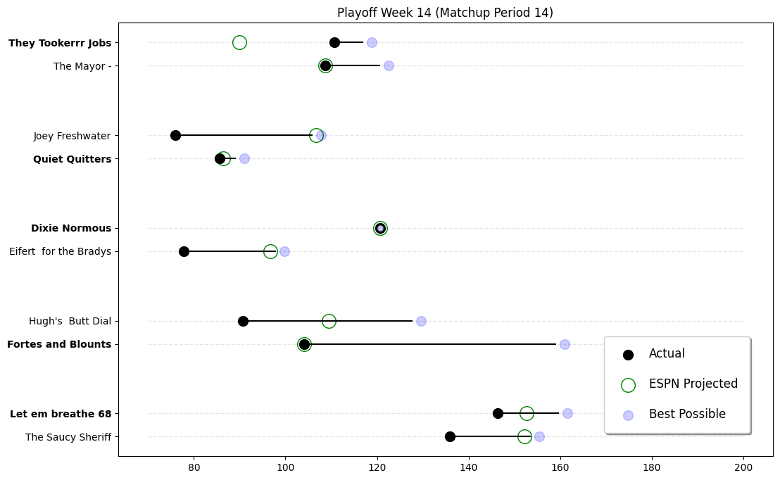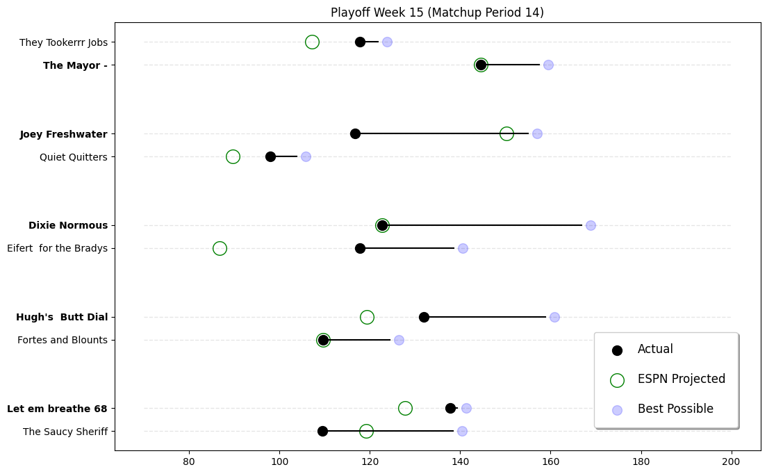 In the battle for 5th place seeding, Trevor DEMOLISHED David 243.36 to 195.54! David, you picked the wrong time to forget how to set a lineup—that’s a rough showing when it counts! Trevor, you showed up like you still had something to prove!